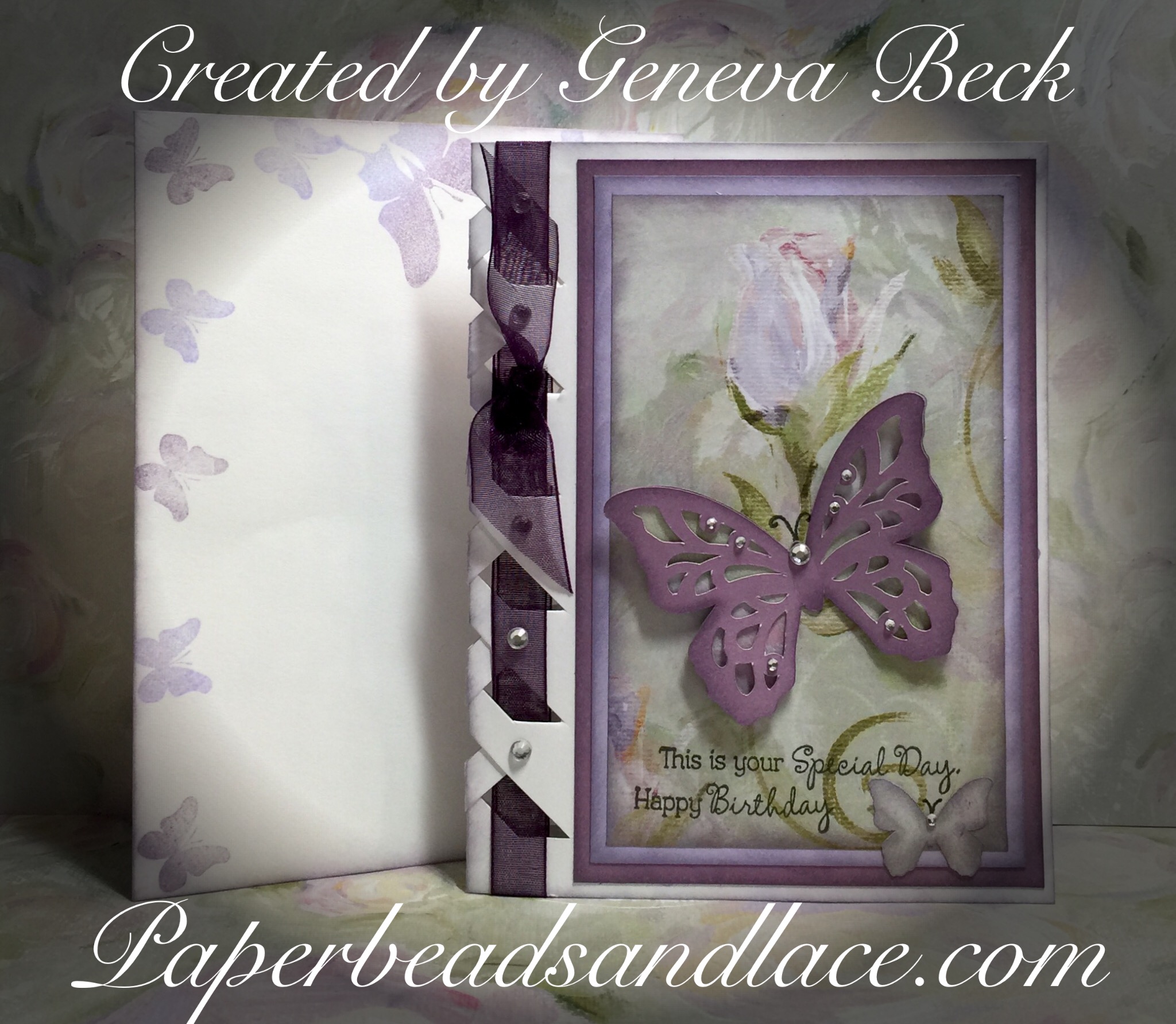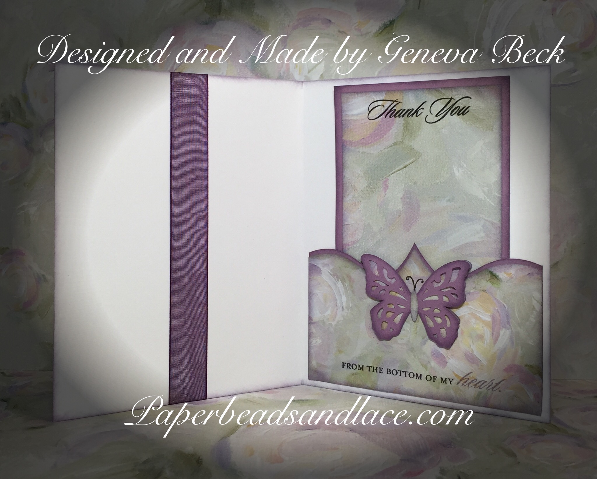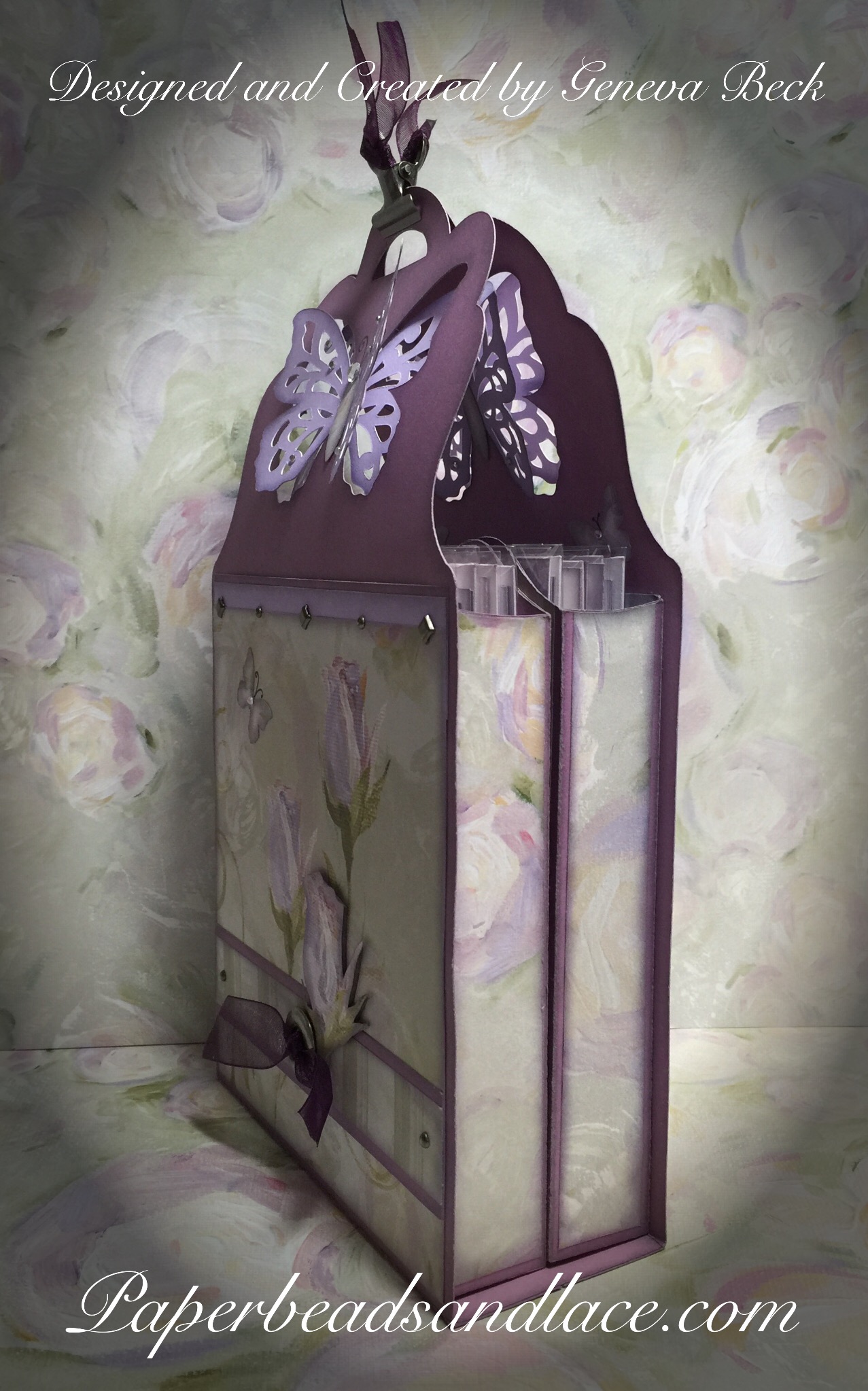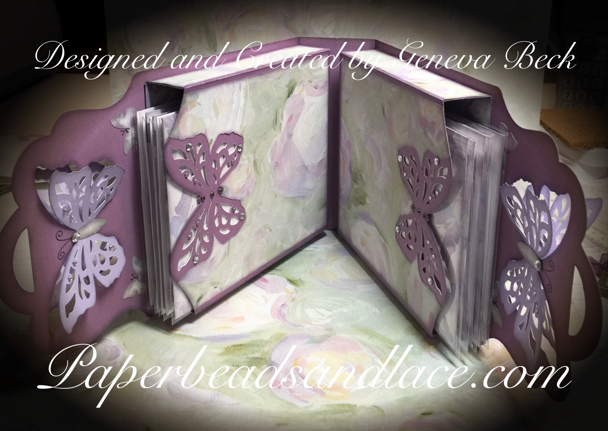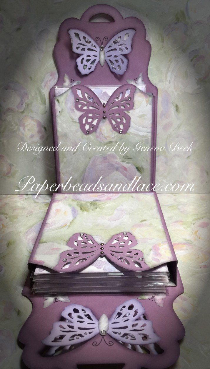 I was asked to make a special Card Box Set that would house 10 Cards in Purple and Lilic. My mind quickly went back in time to a paper collection called Floral Expressions. I was thinking maybe 2009, well I found it went back further than that. It was in 2006 when we had this collection. So I reworked a box I had created in Design Space and decided to incorporate a butterfly in the design. I used an image from the latest CTMH cartridge “Artistry”, image # M58A2E4. I first just used the shape outline to cut the  butterfly shape into my box design. As I worked with it I changed the body on the butterfly so it would fit in the space overlapping it enough as to create 3D wings using the top layer of said butterfly.  It really worked out very nicely.