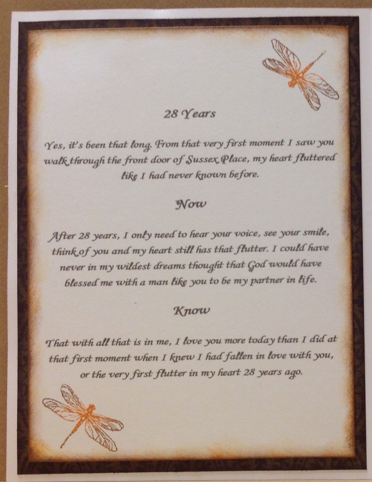 This is the card I made this year for my Husband on our Anniversary. When I saw the dragonfly stamp I knew I had to use it for a card for him. The inside says why, I used the Buzz and Bumble Paper Collection. He now looks for a hand made card every year. The card is a standard size card, and the inside was done on my computer using the color setting to match our desert sand color. I love being able to match our colors for the inside of the cards. Close To My Heart is just the best and provides us with great supplies to create beautiful pieces of Art.